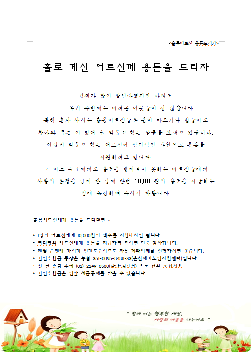 홀로계신 어르신께 용돈을 드리자 페이지 정보 작성자 은천노인복지회 작성일17-12-06 14:55 조회82,459회 댓글0건 관련링크 이전글 다음글 목록 답변 본문 홀몸 어르신께 용돈을 드리는 일에 함께 동참하여 주세요~~ 이전글 다음글 목록 답변