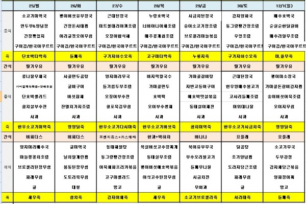 11월넷째주식단표 페이지 정보 작성자 은천노인복지회 작성일19-11-27 09:21 조회39,401회 댓글0건 관련링크 이전글 다음글 목록 답변 본문 ※ 모든 식사에는 잡곡밥과 김치가 제공됩니다. ※ 식단은 식재료수급에 의해 변경될 수 있습니다. 이전글 다음글 목록 답변