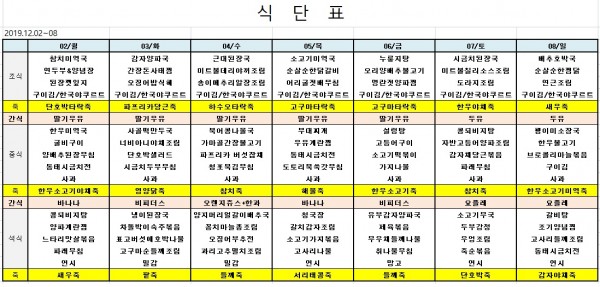 12월첫째주식단표 페이지 정보 작성자 은천노인복지회 작성일19-12-02 18:02 조회39,288회 댓글0건 관련링크 이전글 다음글 목록 답변 본문 ※ 모든 식사에는 잡곡밥과 김치가 제공됩니다. ※ 식단은 식재료수급에 의해 변경될 수 있습니다. 이전글 다음글 목록 답변