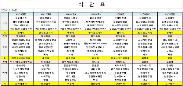 12월 셋째주 식단표 페이지 정보 작성자 은천노인복지회 작성일19-12-15 15:47 조회38,266회 댓글0건 관련링크 이전글 다음글 목록 답변 본문 ※ 모든 식사에는 잡곡밥과 김치가 제공됩니다. ※ 식단은 식재료수급에 의해 변경될 수 있습니다. 이전글 다음글 목록 답변
