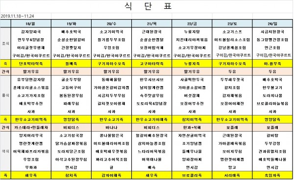 11월 셋째주 식단표 페이지 정보 작성자 은천노인복지회 작성일19-11-15 14:42 조회40,263회 댓글0건 관련링크 이전글 다음글 목록 답변 본문 ※ 모든 식사에는 잡곡밥과 김치가 제공됩니다. ※ 식단은 식재료수급에 의해 변경될 수 있습니다. 이전글 다음글 목록 답변