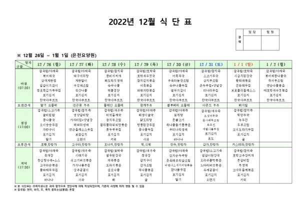 12월 넷째주 식단표 페이지 정보 작성자 은천노인복지회 작성일22-12-26 14:01 조회87,929회 댓글0건 관련링크 이전글 다음글 목록 답변 본문 . 이전글 다음글 목록 답변