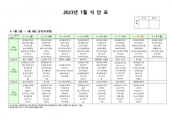 23년 1월 첫째주 식단표 페이지 정보 작성자 은천노인복지회 작성일22-12-30 15:21 조회86,733회 댓글0건 관련링크 이전글 다음글 목록 답변 본문 . 이전글 다음글 목록 답변
