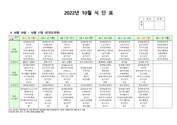 10월 둘째주 식단표 페이지 정보 작성자 은천노인복지회 작성일22-10-06 15:49 조회95,801회 댓글0건 관련링크 이전글 다음글 목록 답변 본문 . 이전글 다음글 목록 답변
