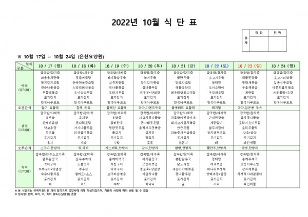 10월 셋째주 식단표 페이지 정보 작성자 은천노인복지회 작성일22-10-13 17:30 조회95,269회 댓글0건 관련링크 이전글 다음글 목록 답변 본문 . 이전글 다음글 목록 답변