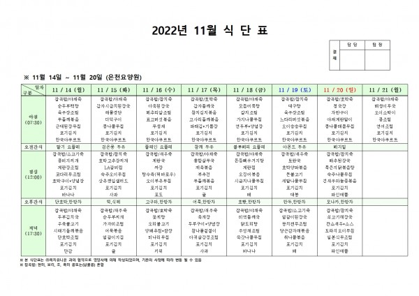 11월 셋째주 식단표 페이지 정보 작성자 은천노인복지회 작성일22-11-10 10:10 조회92,202회 댓글0건 관련링크 이전글 다음글 목록 답변 본문 . 이전글 다음글 목록 답변