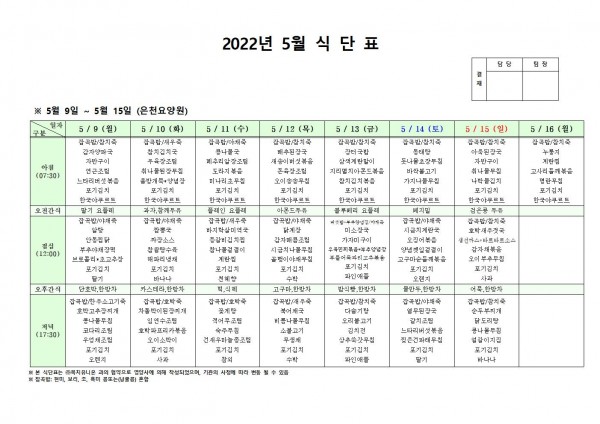 5월 둘째주 식단표 페이지 정보 작성자 은천노인복지회 작성일22-05-06 10:04 조회107,587회 댓글0건 관련링크 이전글 다음글 목록 답변 본문 . 이전글 다음글 목록 답변