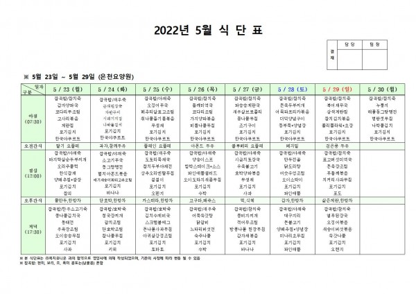 5월 넷째주 식단표 페이지 정보 작성자 은천노인복지회 작성일22-05-19 16:56 조회106,189회 댓글0건 관련링크 이전글 다음글 목록 답변 본문 . 이전글 다음글 목록 답변