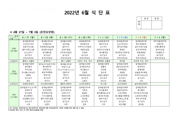 6월 넷째주 식단표 페이지 정보 작성자 은천노인복지회 작성일22-06-23 17:38 조회102,599회 댓글0건 관련링크 이전글 다음글 목록 답변 본문 . 이전글 다음글 목록 답변
