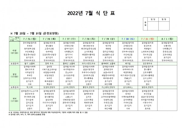 7월 넷째주 식단표 페이지 정보 작성자 은천노인복지회 작성일22-07-21 17:04 조회102,423회 댓글0건 관련링크 이전글 다음글 목록 답변 본문 . 이전글 다음글 목록 답변
