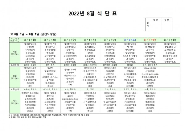 8월 첫째주 식단표 페이지 정보 작성자 은천노인복지회 작성일22-08-01 13:36 조회101,670회 댓글0건 관련링크 이전글 다음글 목록 답변 본문 . 이전글 다음글 목록 답변