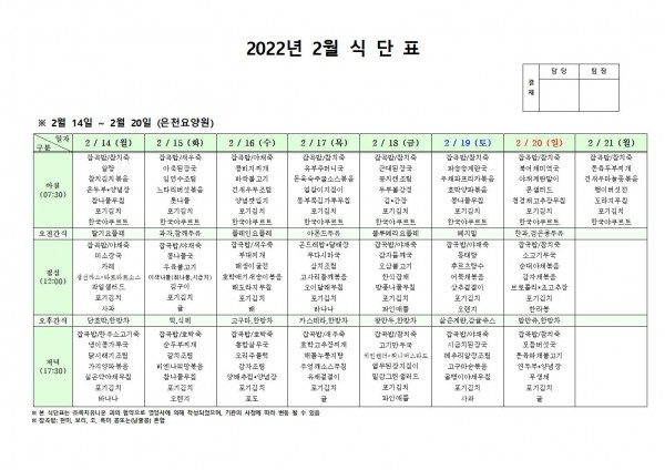 2월 셋째주 식단표 페이지 정보 작성자 은천노인복지회 작성일22-02-10 16:28 조회119,908회 댓글0건 관련링크 이전글 다음글 목록 답변 본문 . 이전글 다음글 목록 답변