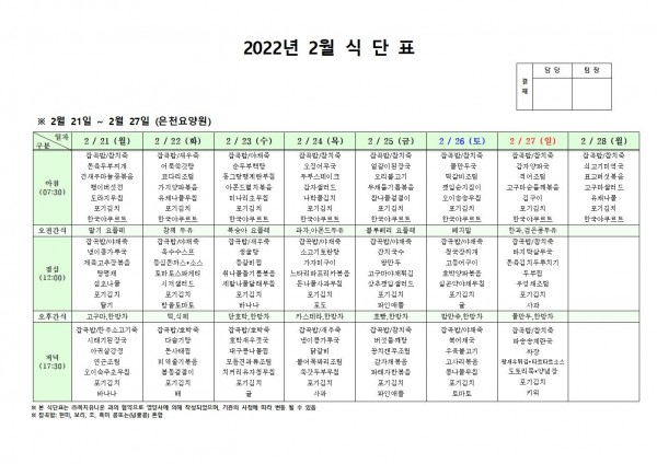 2월 넷째주 식단표 페이지 정보 작성자 은천노인복지회 작성일22-02-25 09:21 조회118,312회 댓글0건 관련링크 이전글 다음글 목록 답변 본문 . 이전글 다음글 목록 답변