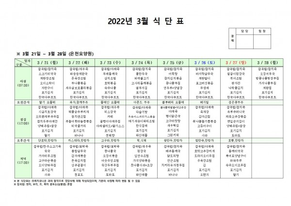 3월 넷째주 식단표 페이지 정보 작성자 은천노인복지회 작성일22-03-17 17:31 조회113,999회 댓글0건 관련링크 이전글 다음글 목록 답변 본문 . 이전글 다음글 목록 답변