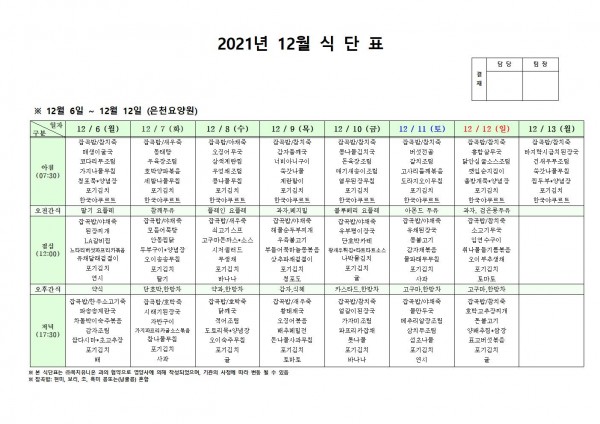 12월 둘째주 식단표 페이지 정보 작성자 은천노인복지회 작성일21-12-03 10:52 조회123,937회 댓글0건 관련링크 이전글 다음글 목록 답변 본문 . 이전글 다음글 목록 답변