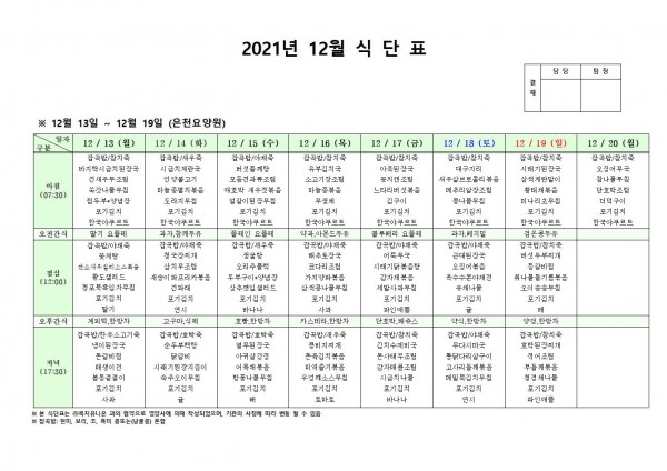 12월 셋째주 식단표 페이지 정보 작성자 은천노인복지회 작성일21-12-15 11:52 조회123,205회 댓글0건 관련링크 이전글 다음글 목록 답변 본문 . 이전글 다음글 목록 답변