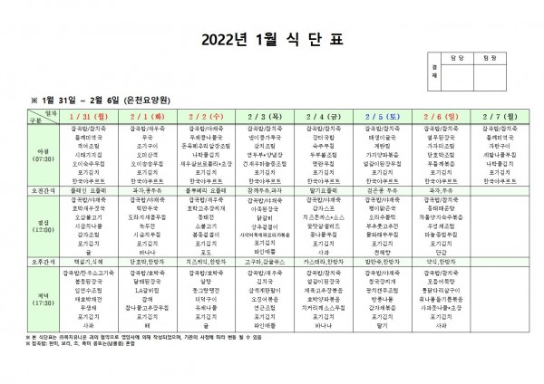2월 첫째주 식단표 페이지 정보 작성자 은천노인복지회 작성일22-01-29 11:54 조회119,373회 댓글0건 관련링크 이전글 다음글 목록 답변 본문 . 이전글 다음글 목록 답변