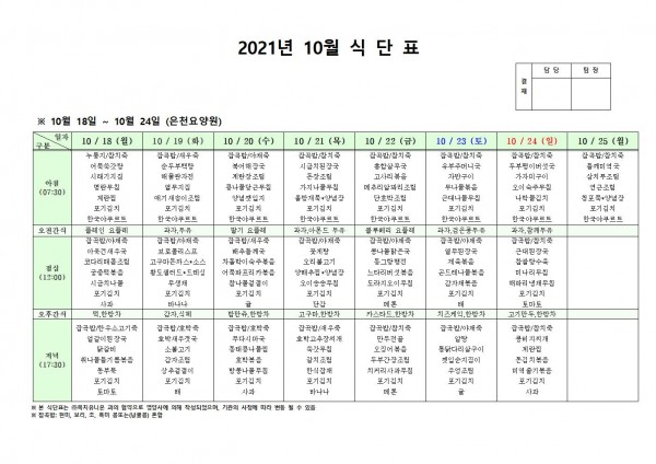 10월 셋째주 식단표 페이지 정보 작성자 은천노인복지회 작성일21-10-14 16:24 조회126,650회 댓글0건 관련링크 이전글 다음글 목록 답변 본문 . 이전글 다음글 목록 답변