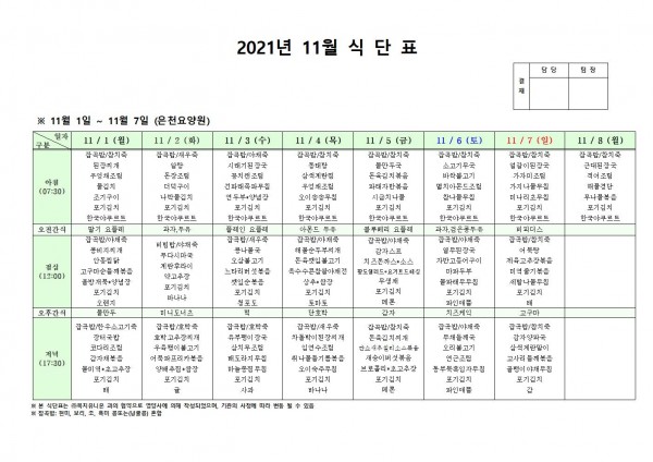 11월 첫째주 식단표 페이지 정보 작성자 은천노인복지회 작성일21-10-28 16:55 조회126,470회 댓글0건 관련링크 이전글 다음글 목록 답변 본문 . 이전글 다음글 목록 답변