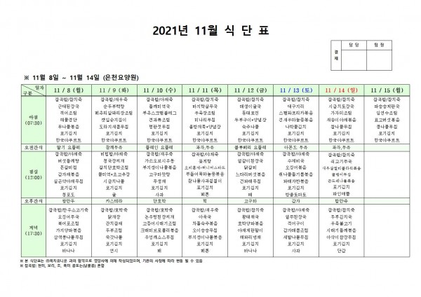11월 둘째주 식단표 페이지 정보 작성자 은천노인복지회 작성일21-11-04 16:57 조회126,901회 댓글0건 관련링크 이전글 다음글 목록 답변 본문 . 이전글 다음글 목록 답변