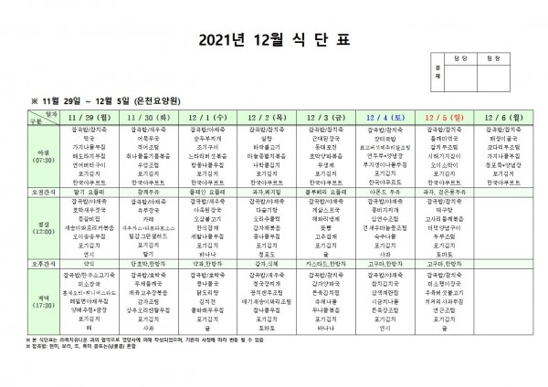 12월 첫째주 식단표 페이지 정보 작성자 은천노인복지회 작성일21-11-25 17:12 조회125,217회 댓글0건 관련링크 이전글 다음글 목록 답변 본문 . 이전글 다음글 목록 답변