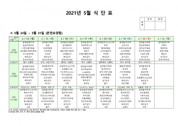 5월 넷째 주 식단표 페이지 정보 작성자 은천노인복지회 작성일21-05-21 16:38 조회136,239회 댓글0건 관련링크 이전글 다음글 목록 답변 본문 5월 넷째 주 식단표 이전글 다음글 목록 답변