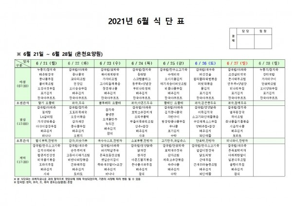 6월 넷째주 식단표 페이지 정보 작성자 은천노인복지회 작성일21-06-17 15:01 조회134,186회 댓글0건 관련링크 이전글 다음글 목록 답변 본문 . 이전글 다음글 목록 답변