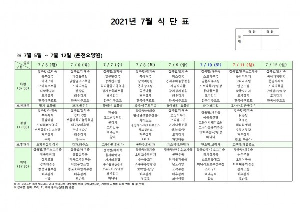 7월 첫째주 식단표 페이지 정보 작성자 은천노인복지회 작성일21-07-02 16:57 조회134,529회 댓글0건 관련링크 이전글 다음글 목록 답변 본문 . 이전글 다음글 목록 답변