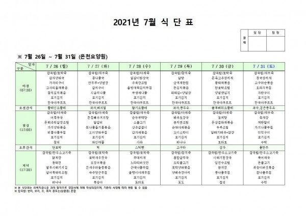 7월 넷째주 식단표 페이지 정보 작성자 은천노인복지회 작성일21-08-05 10:26 조회132,220회 댓글0건 관련링크 이전글 다음글 목록 답변 본문 . 이전글 다음글 목록 답변