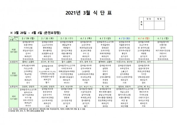 3월 다섯째주 식단표 페이지 정보 작성자 은천노인복지회 작성일21-03-25 17:09 조회141,394회 댓글0건 관련링크 이전글 다음글 목록 답변 본문 3월 다섯째주 식단표 이전글 다음글 목록 답변