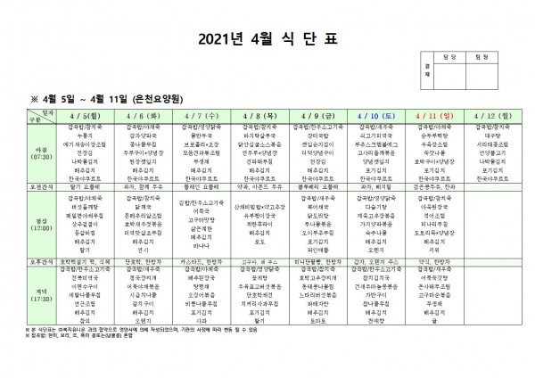 4월 첫째주 식단표 페이지 정보 작성자 은천노인복지회 작성일21-04-01 18:24 조회142,032회 댓글0건 관련링크 이전글 다음글 목록 답변 본문 4월 첫째주 식단표 이전글 다음글 목록 답변
