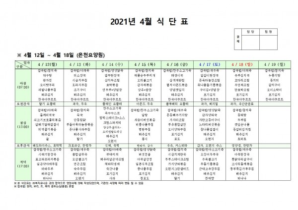 4월 둘째주 식단표 페이지 정보 작성자 은천노인복지회 작성일21-04-08 19:12 조회140,346회 댓글0건 관련링크 이전글 다음글 목록 답변 본문 4월 둘째주 식단표 이전글 다음글 목록 답변