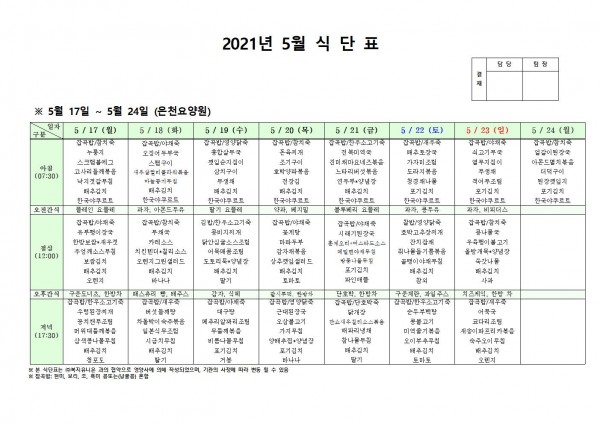 5월 셋째주 식단표 페이지 정보 작성자 은천노인복지회 작성일21-05-13 19:27 조회136,978회 댓글0건 관련링크 이전글 다음글 목록 답변 본문 5월 셋째주 식단표 이전글 다음글 목록 답변