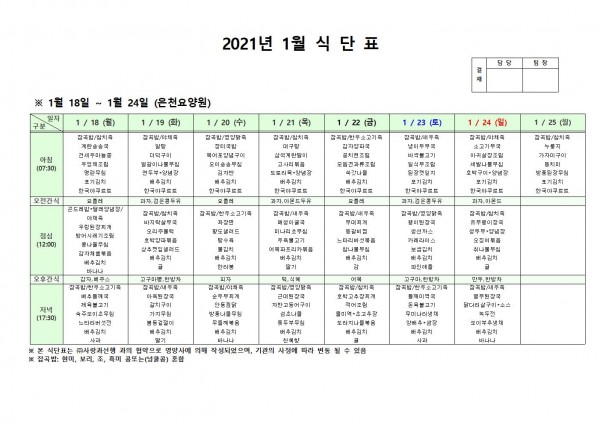 1월 셋째주 식단표 페이지 정보 작성자 은천노인복지회 작성일21-01-15 10:02 조회148,664회 댓글0건 관련링크 이전글 다음글 목록 답변 본문 . 이전글 다음글 목록 답변