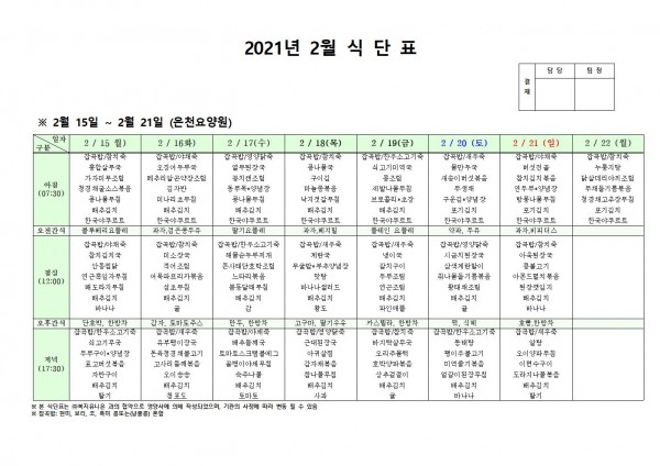 2월 셋째주 식단표 페이지 정보 작성자 은천노인복지회 작성일21-02-15 14:12 조회147,301회 댓글0건 관련링크 이전글 다음글 목록 답변 본문 2월 식단표 [이 게시물은 은천노인복지회님에 의해 2021-03-12 17:18:24 공지사항에서 이동 됨] 이전글 다음글 목록 답변