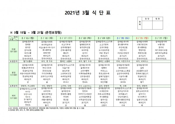 3월 셋째주 식단표 페이지 정보 작성자 은천노인복지회 작성일21-03-12 11:41 조회144,283회 댓글0건 관련링크 이전글 다음글 목록 답변 본문 3월 셋째주 식단표[이 게시물은 은천노인복지회님에 의해 2021-03-12 17:18:24 공지사항에서 이동 됨] 이전글 다음글 목록 답변