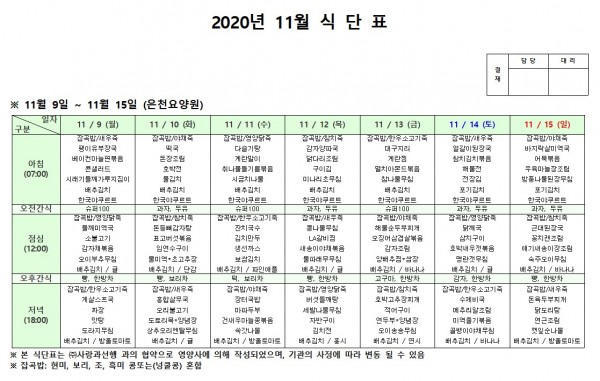 11월 둘째주 식단표 페이지 정보 작성자 은천노인복지회 작성일20-12-08 18:09 조회155,509회 댓글0건 관련링크 이전글 다음글 목록 답변 본문 11월 둘째주 식단표 이전글 다음글 목록 답변