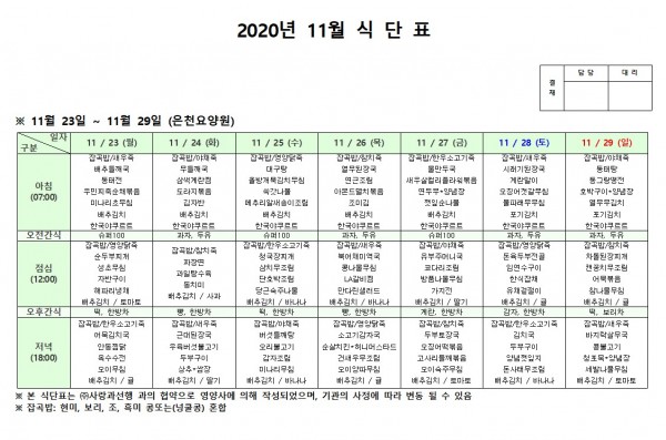 11월 넷째주 식단표 페이지 정보 작성자 은천노인복지회 작성일20-12-08 18:10 조회154,405회 댓글0건 관련링크 이전글 다음글 목록 답변 본문 . 이전글 다음글 목록 답변
