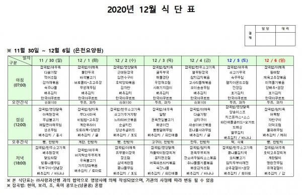 12월 첫째주 식단표 페이지 정보 작성자 은천노인복지회 작성일20-12-08 18:10 조회154,282회 댓글0건 관련링크 이전글 다음글 목록 답변 본문 . 이전글 다음글 목록 답변