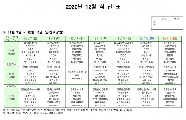 12월 둘째주 식단표 페이지 정보 작성자 은천노인복지회 작성일20-12-08 18:11 조회154,125회 댓글0건 관련링크 이전글 다음글 목록 답변 본문 . 이전글 다음글 목록 답변