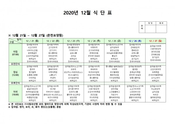 12월 넷째주 식단표 페이지 정보 작성자 은천노인복지회 작성일20-12-21 17:39 조회153,391회 댓글0건 관련링크 이전글 다음글 목록 답변 본문 . 이전글 다음글 목록 답변