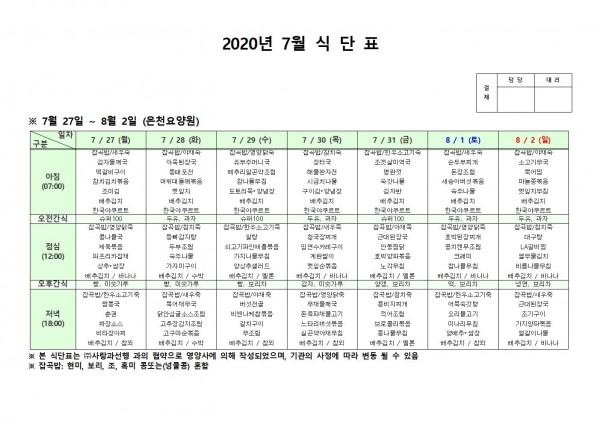 7월 다섯째주 식단표 페이지 정보 작성자 은천노인복지회 작성일20-08-10 11:32 조회165,719회 댓글0건 관련링크 이전글 다음글 목록 답변 본문 . 이전글 다음글 목록 답변