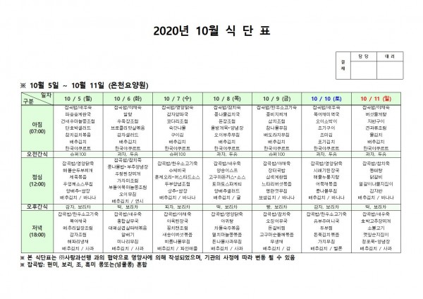 10월 둘째주 식단표 페이지 정보 작성자 은천노인복지회 작성일20-10-12 14:45 조회160,947회 댓글0건 관련링크 이전글 다음글 목록 답변 본문 . 이전글 다음글 목록 답변