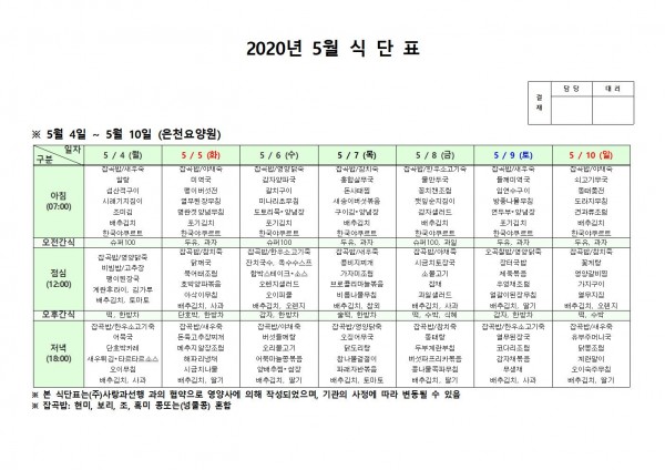 5월 첫째주 식단표 페이지 정보 작성자 은천노인복지회 작성일20-05-18 16:01 조회173,222회 댓글0건 관련링크 이전글 다음글 목록 답변 본문 . 이전글 다음글 목록 답변