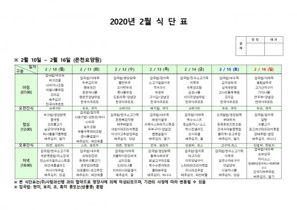 2월 둘째주 식단표 페이지 정보 작성자 은천노인복지회 작성일20-02-17 10:27 조회182,261회 댓글0건 관련링크 이전글 다음글 목록 답변 본문 ㅇㅅㅇ 이전글 다음글 목록 답변