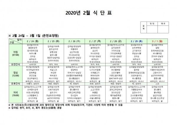 2월 넷째주 식단표 페이지 정보 작성자 은천노인복지회 작성일20-03-02 13:41 조회180,397회 댓글0건 관련링크 이전글 다음글 목록 답변 본문 2월 넷째주 식단표입니다 이전글 다음글 목록 답변