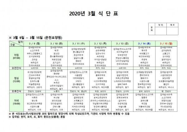 3월 둘째주 식단표 페이지 정보 작성자 은천노인복지회 작성일20-03-23 14:49 조회180,539회 댓글0건 관련링크 이전글 다음글 목록 답변 본문 . 이전글 다음글 목록 답변
