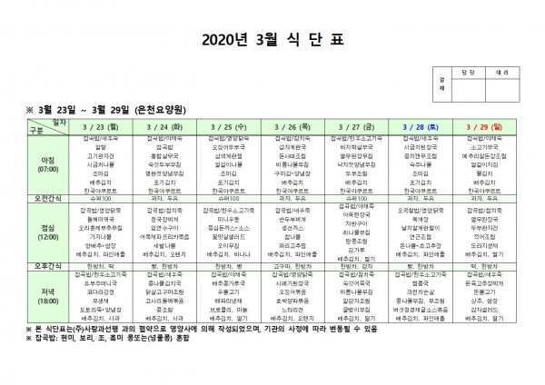 3월 넷째주 식단표 페이지 정보 작성자 은천노인복지회 작성일20-03-31 16:09 조회180,321회 댓글0건 관련링크 이전글 다음글 목록 답변 본문 . 이전글 다음글 목록 답변
