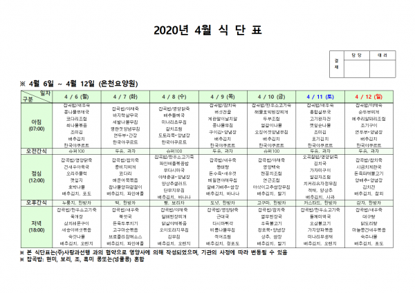 4월 첫째주 식단표 페이지 정보 작성자 은천노인복지회 작성일20-04-13 15:04 조회178,946회 댓글0건 관련링크 이전글 다음글 목록 답변 본문 . 이전글 다음글 목록 답변