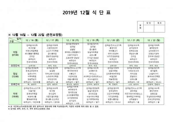 12월 셋째주 식단표 페이지 정보 작성자 은천노인복지회 작성일19-12-23 14:06 조회188,883회 댓글0건 관련링크 이전글 다음글 목록 답변 본문 12월 셋째주 식단표입니다. 이전글 다음글 목록 답변